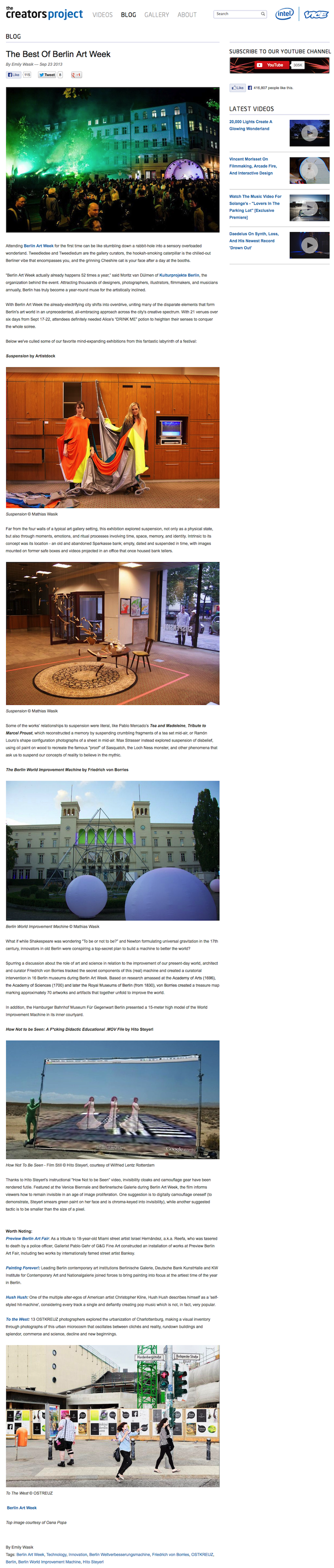 24 Sep, 2013 The Best Of Berlin Art Week The Creators Project 24 Sep, 2013 Leave a Reply Cancel replyYour email address will not be published.Name * Email * Website Save my name, email, and website in this browser for the next time I comment. Δ
